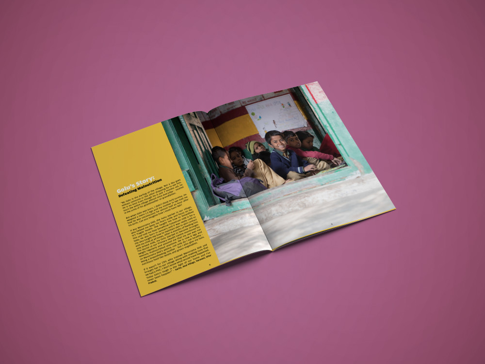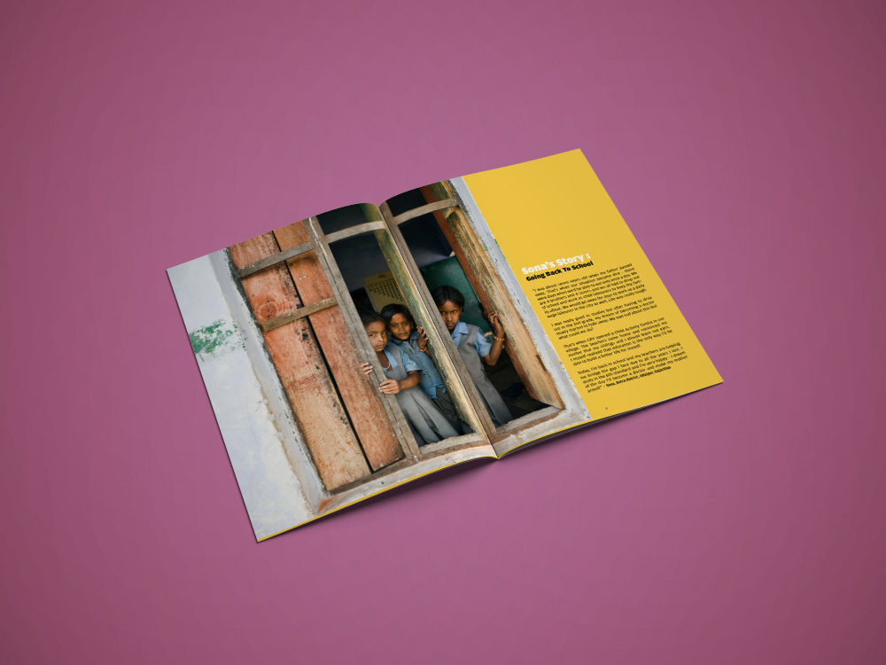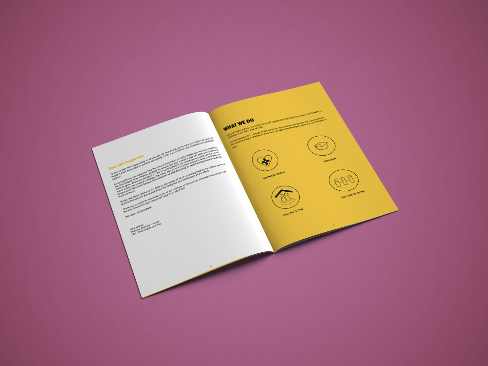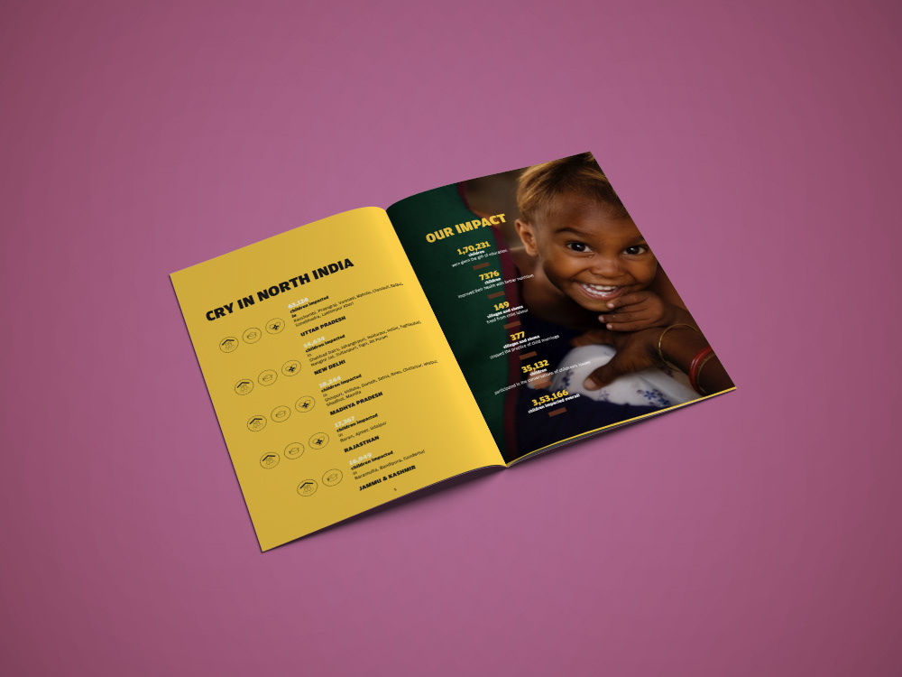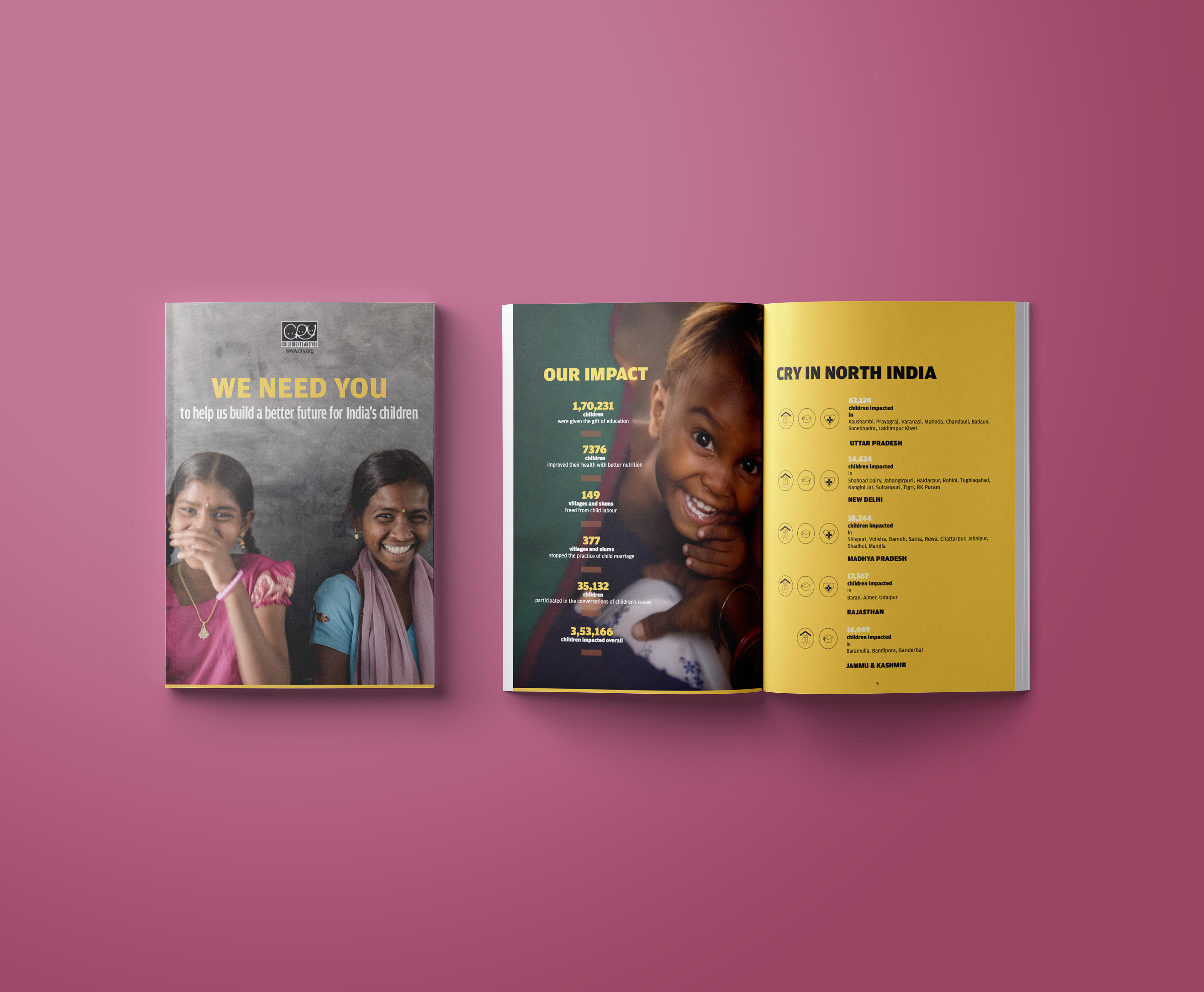 Publication Design for Child Rights and You (CRY) India's individual donor brochure to concisely represent their purpose, commitment and impact towards upholding equal protection of child rights.